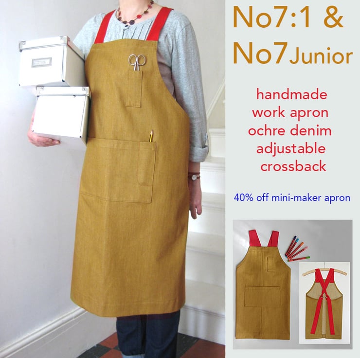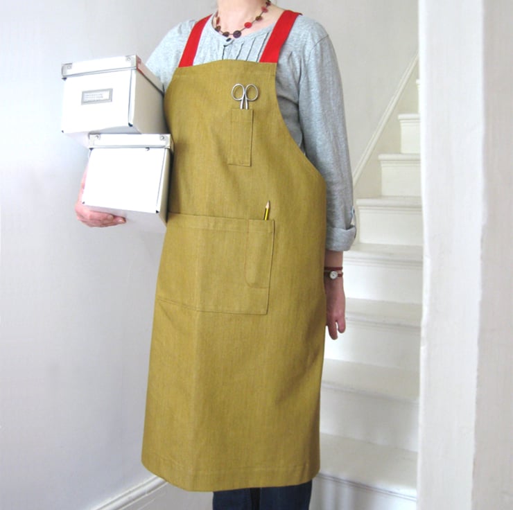 Women's adjustable crossback apron, in tough heavy-weight ochre denim and red straps. Featured 1st of '10 Best Aprons' in The Evening Standard, September 2018! Designed for artists/makers, it's easy to wear all day and adjusts to fit over layers of clothing in a chilly studio! There's a large front pocket with a stitched pencil pocket compartment and a mini pocket on the bib. Beautifully sewn, thoughtfully designed and made-to-last, this apron is highly specialised craftsperson's workwear.