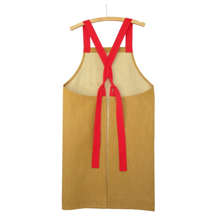 This was my second ever cross back makers apron design, I used the same shape as the first cross back apron but this time added adjustable straps made of herringbone webbing which knot through loops at the back corners of the apron. This beautiful golden denim and red webbing is such a striking combination on this design.