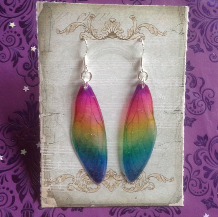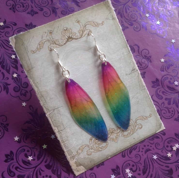 Iridescent fairy wing earrings made from layers of acetate.