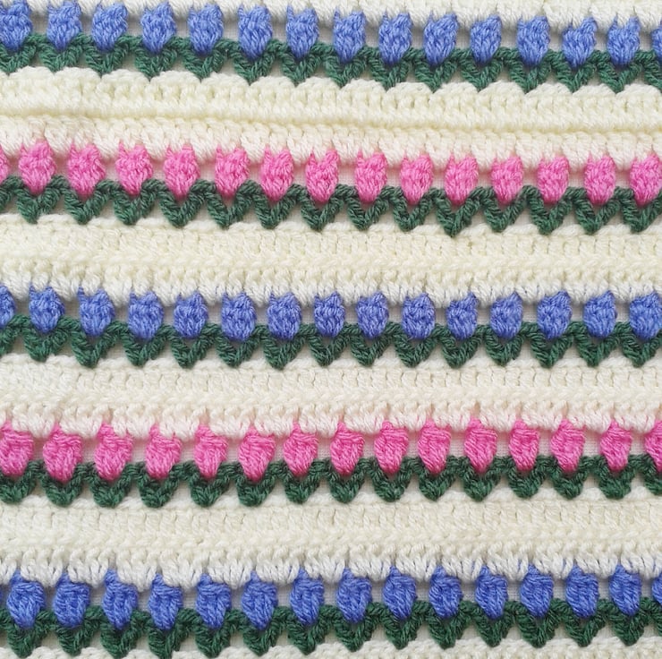 A gorgeous cream made to order blanket approximately 25 x 25 inches. The pretty stitching creates the look of rows of tulips, in a pretty candy pink and light purple. Would make a lovely gift or beautiful nursery decoration.