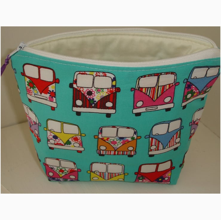 A Zipped Padded Flat-bottomed Purse ideal for holding make up , toiletries , or just keeping your loose bits and pieces together in your handbag. Campervans in a multitude of colours - red blue purple orange brown aqua - stripes and Flower Power designs.