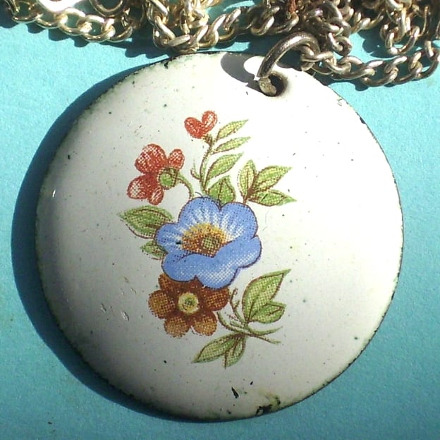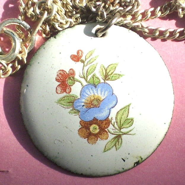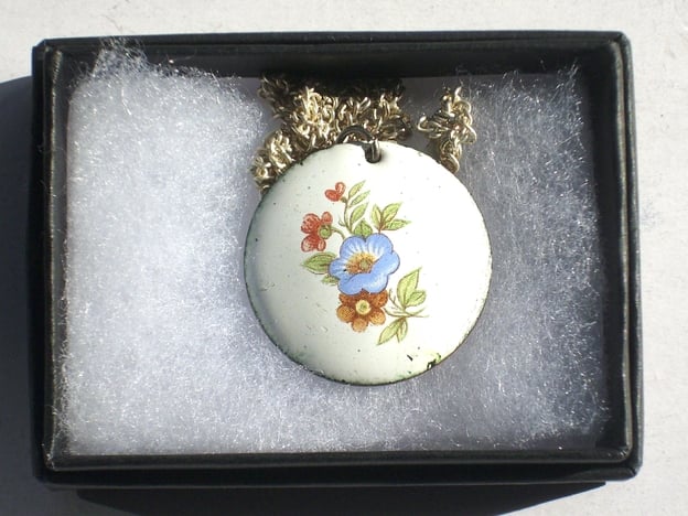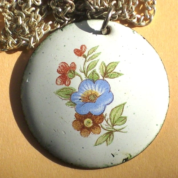This is a white enamel pendant over which I have fired a transfer picture of flowers. The picture is printed in ink that uses enamel pigments.