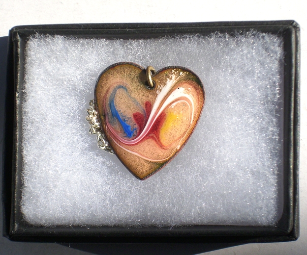 This scrolled glass enamel pendant has a patterning made by drawing a steel tip through the enamel while it is in the kiln at red hot. It has been counter-enamelled to balance the expansion and contraction of the worked surface through numerous firings.