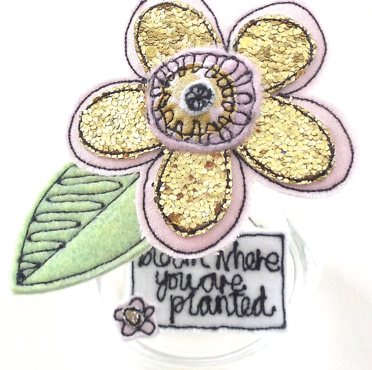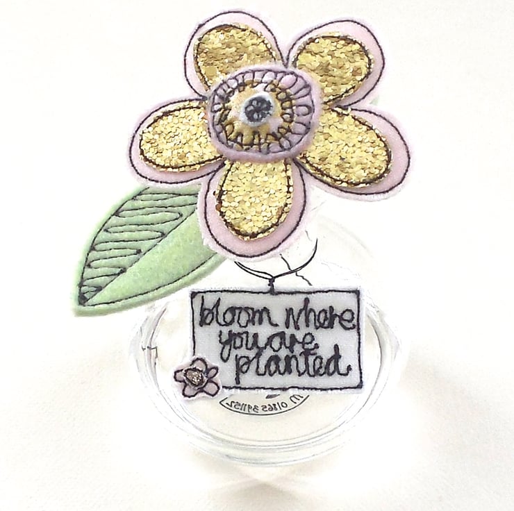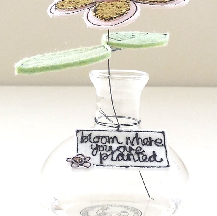 A fabric flower sits in a miniature glass bottle. The flower and leaves are created using sewn fabric and a wire stem holds them in position in acrylic water. The flower and bottle measure about 11cm and the flower about 4cm. Around the bottle neck hangs a sewn fabric label saying 'bloom where you are planted'. Please note: for decorative purposes only.