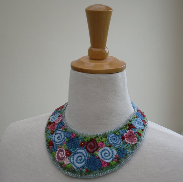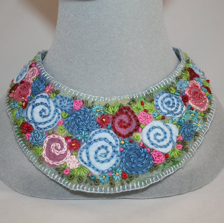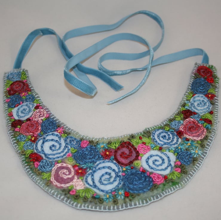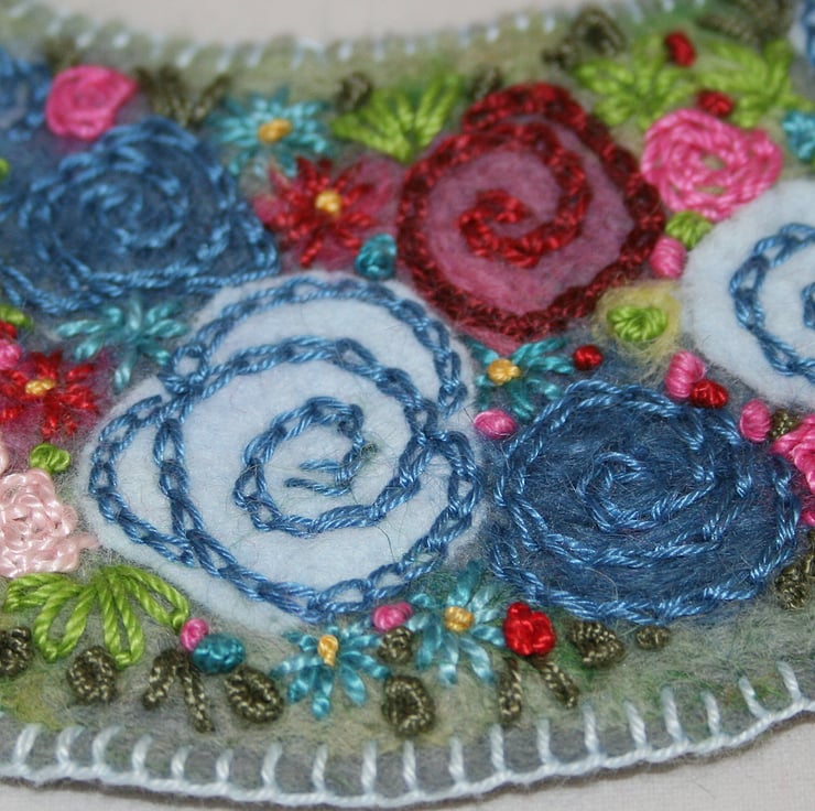 An intensely stitched design of roses and daisies, on a felted background, edged by blanket stitch in blue crochet cotton, forms this striking textile necklace.