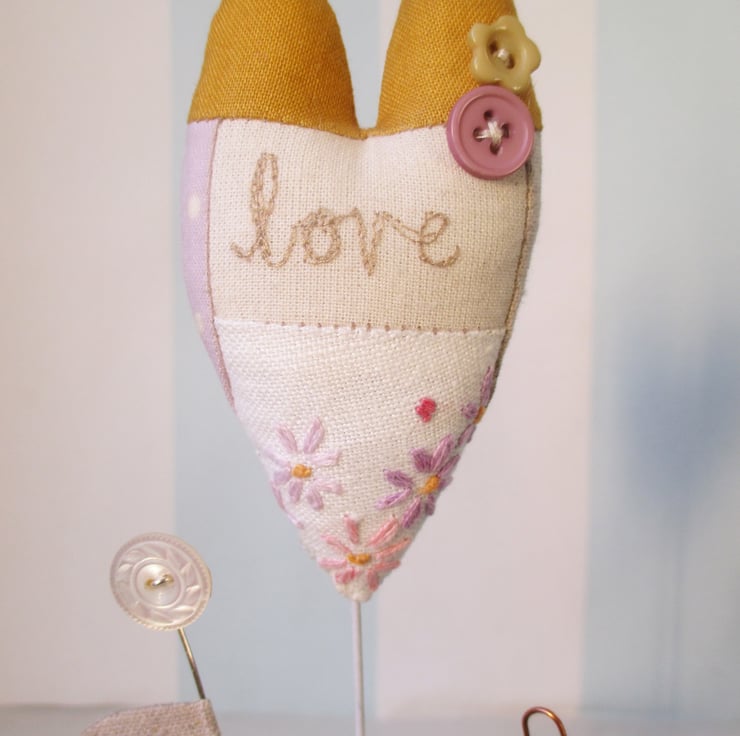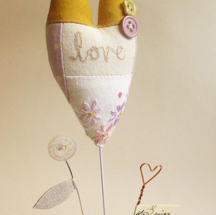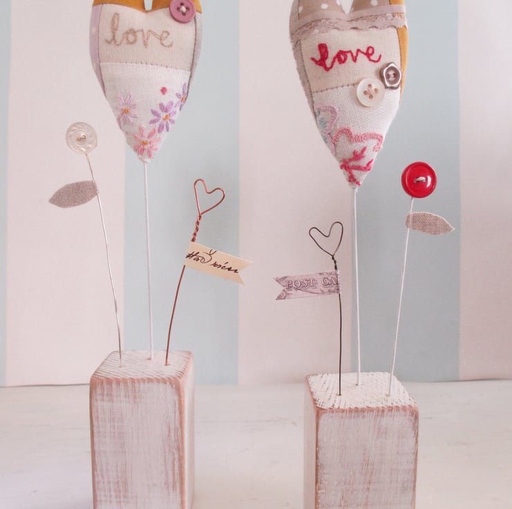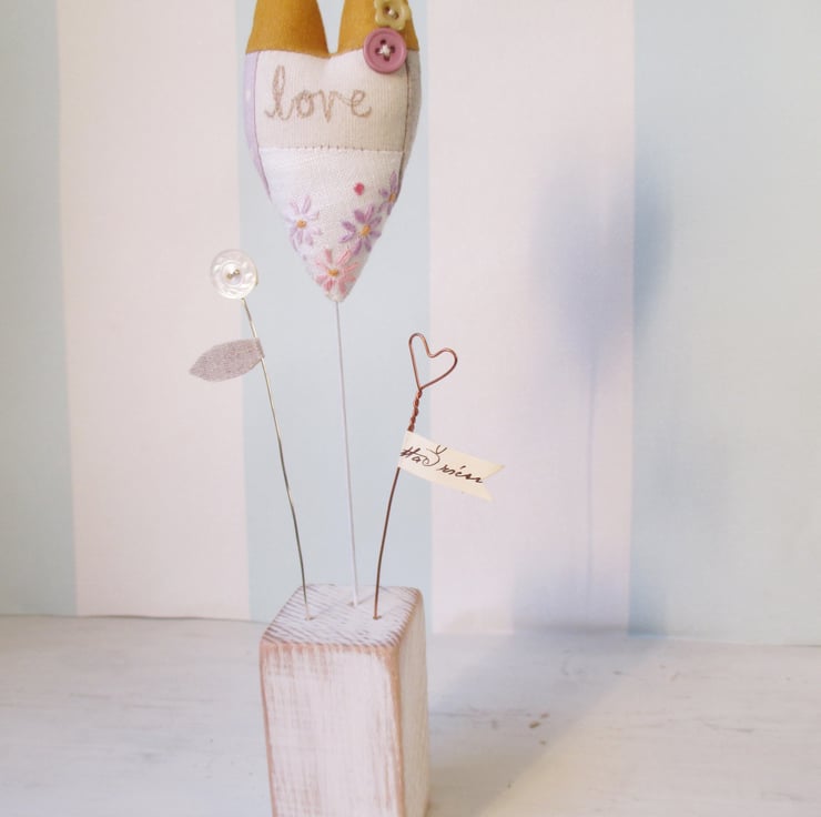 A delicate hand crafted individual token of love, this fabric heart stands on a wooden block.