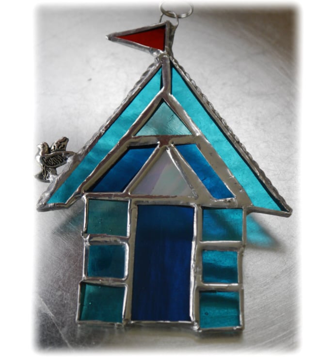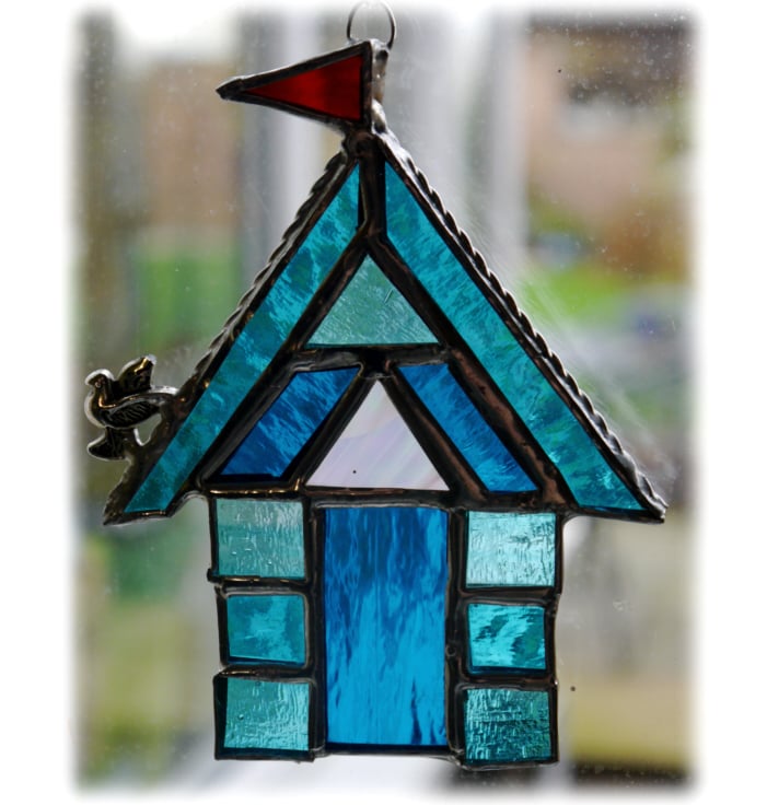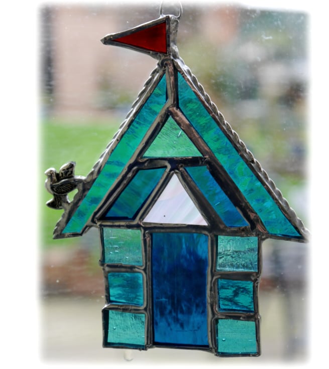 I've made this from 3 types of bright turquoise glass and I've added a little triangular window above the door in iridescent glass.
