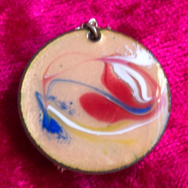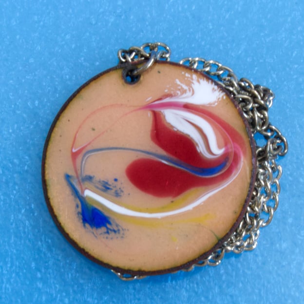 A scrolled glass enamel pendant with patterning made by drawing a steel tip through the enamel while it is in the kiln at red hot.