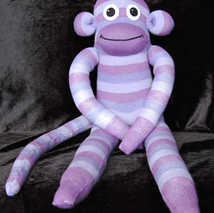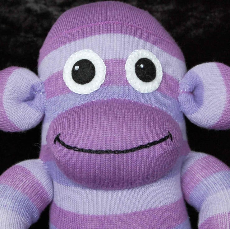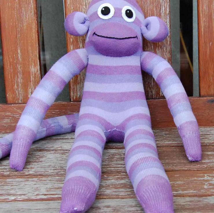 Pansy is a fun soft monkey toy made from brand new stripey socks in shades of lilac/purple and filled with polyester fibrefill conforming to EN71, CE marked and safe for babies, children and adults too!
