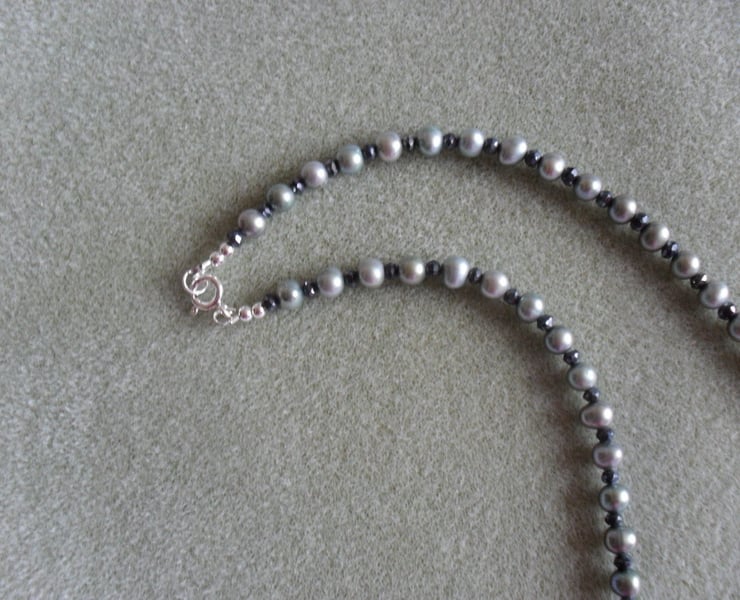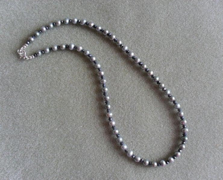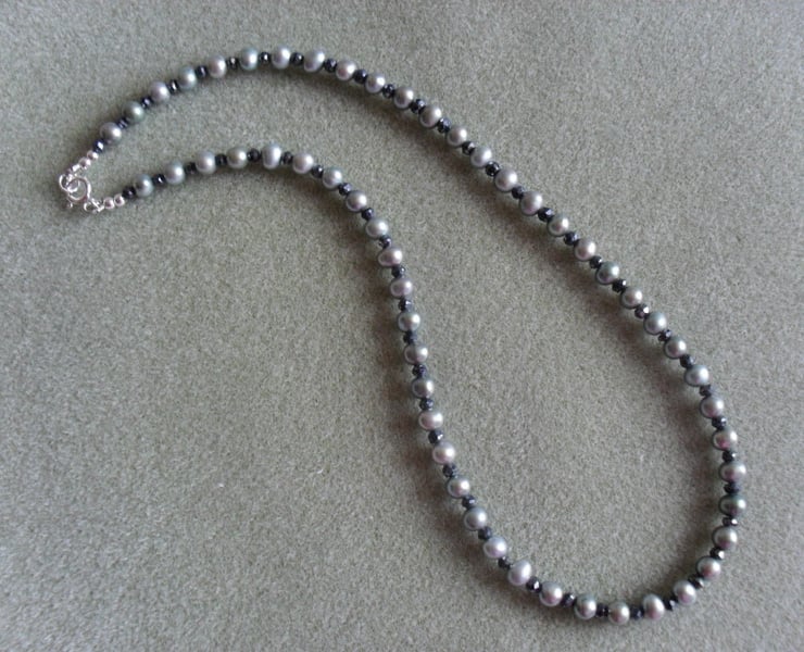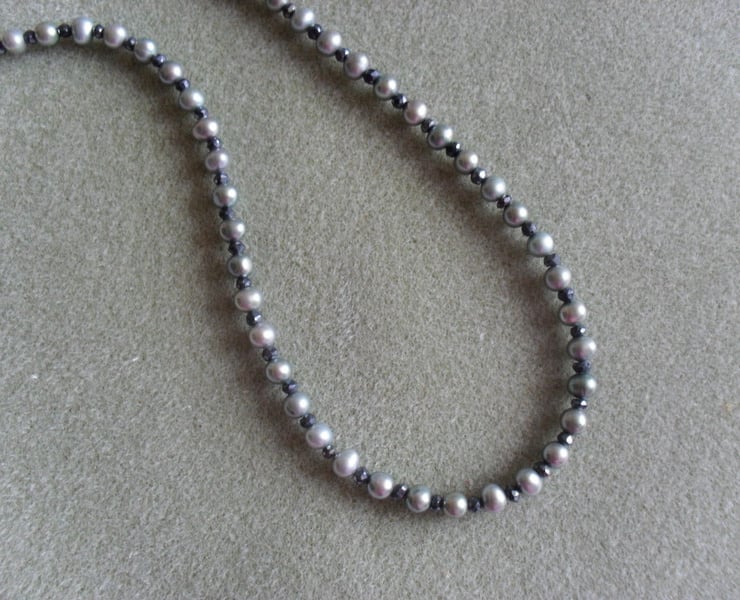 freshwater pearls and black spinel which has been coated to give even more sparkle are attached to a sterling silver bolt ring clasp, ring and beads