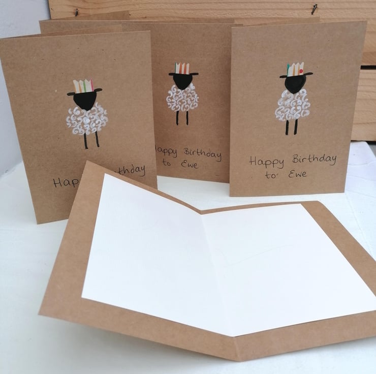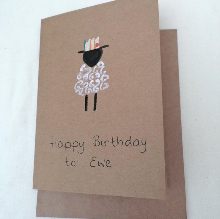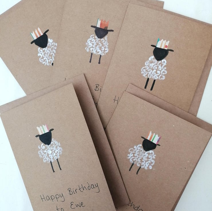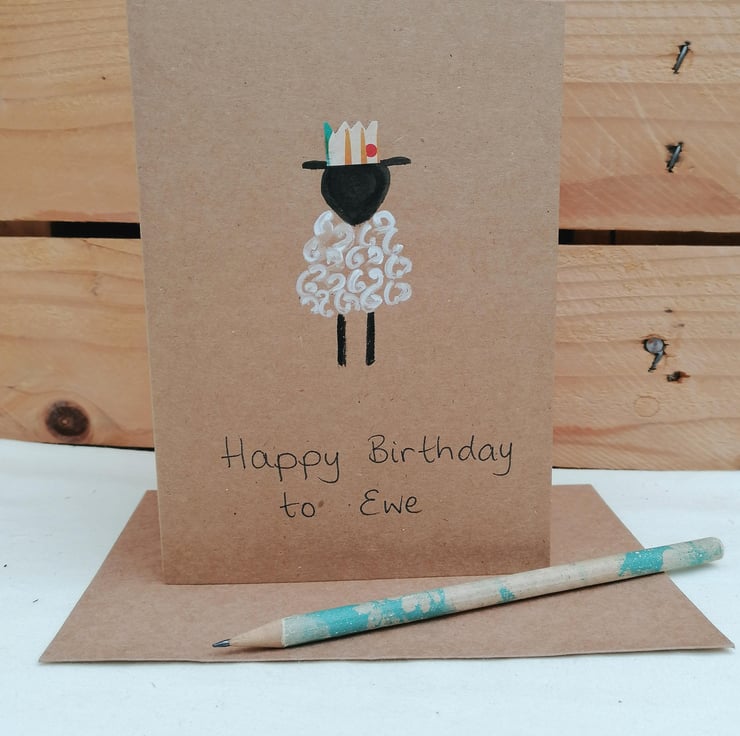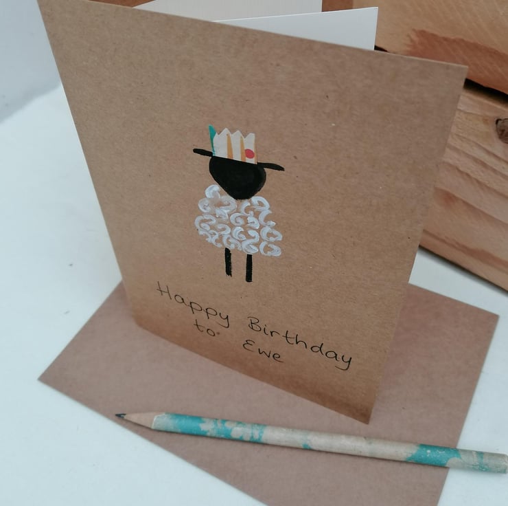 Sheep are always popular and what better way to say Happy Birthday to Ewe than by sending a hand painted card featuring a sheep wearing a party hat. I have cut the hat from upcycled card and attached to the card.