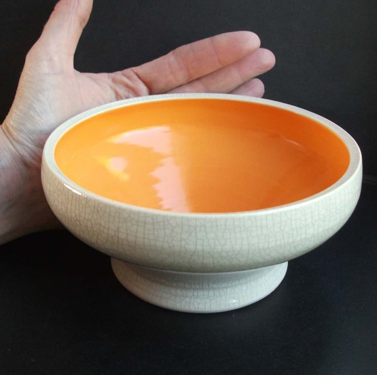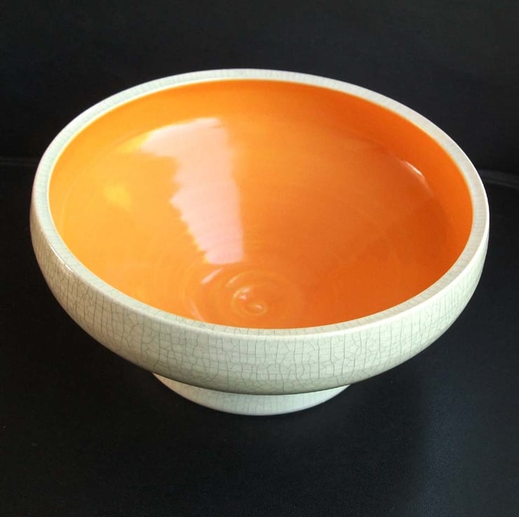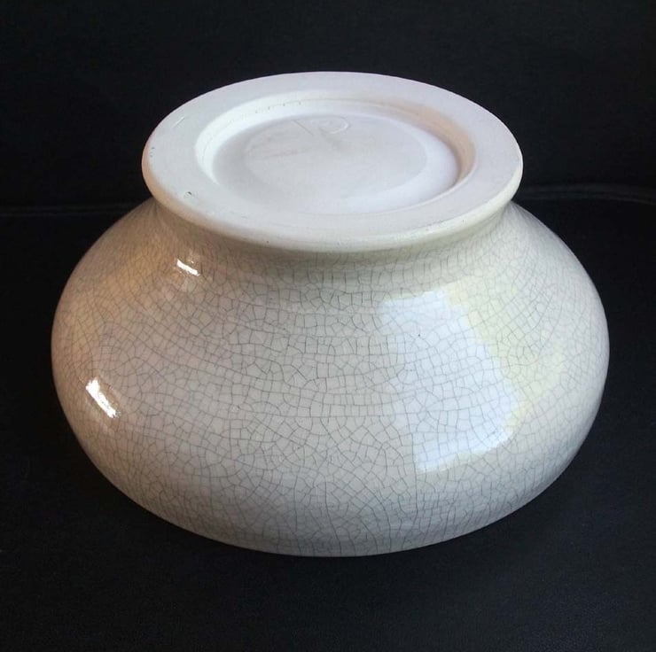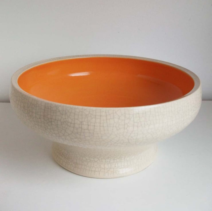 This ceramic bowl has been hand thrown from white earthenware clay. It is finished on the outside with a crackle glaze and on the inside with a bright, glossy glaze.