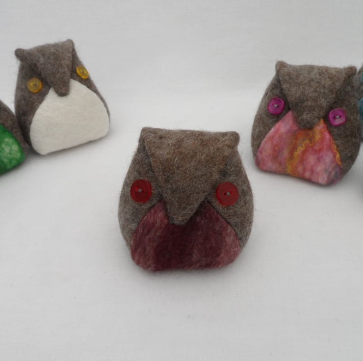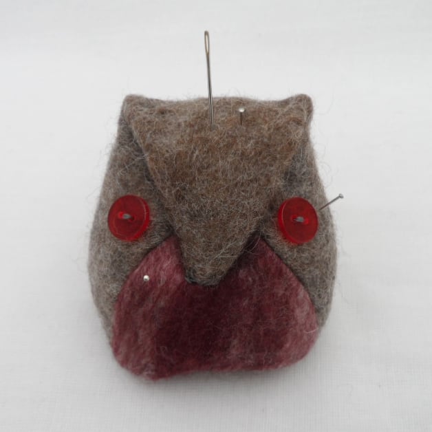 A sweet little owl made from handmade felt which has been sewn into this lovely owl made with natural brown perendale wool with a red merino wool body and red button eyes. The owl has been filled with rice making it ideal for use as a pin cushion. If you don't wish to stab him with pins then he is just as happy sitting on a shelf as a cute ornament.