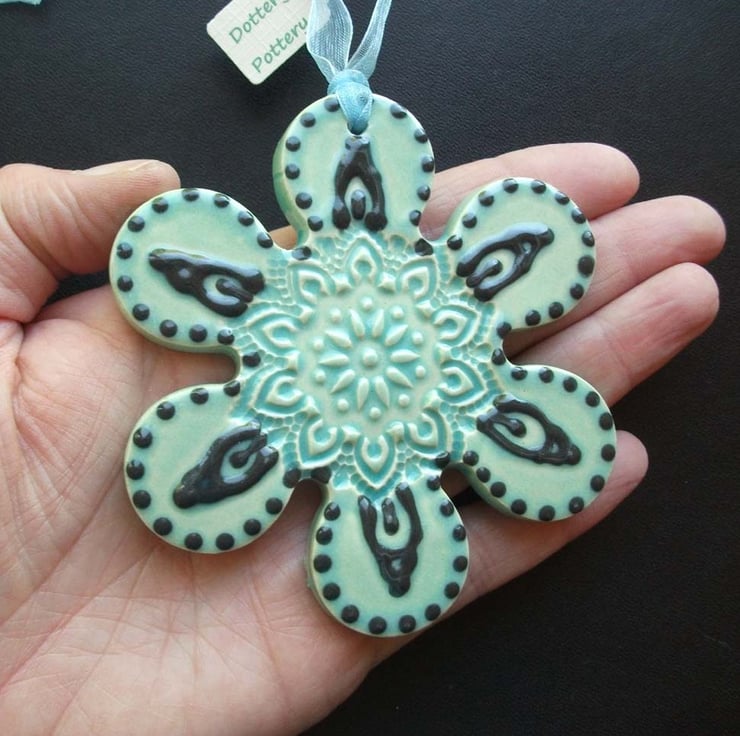This cute little hanging flower decoration is made from white earthenware clay and embossed with pattern.