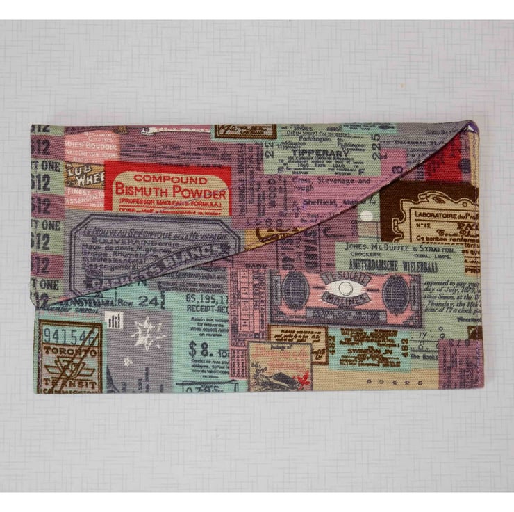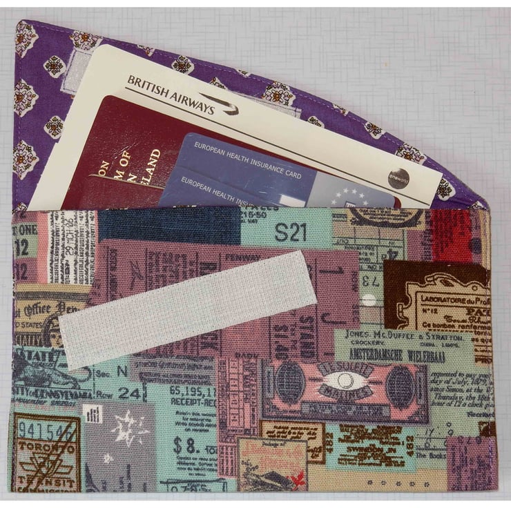 This wallet measures approx. 7.5 x 4.5 inches when closed. It fastens with Velcro and is interfaced and lined with toning print fabric. It is designed to hold passport, tickets and other travel documents, to keep them safe in your handbag or travel bag (see second photo). It is made from a lovely ticket themed cotton fabric, with a linen effect.