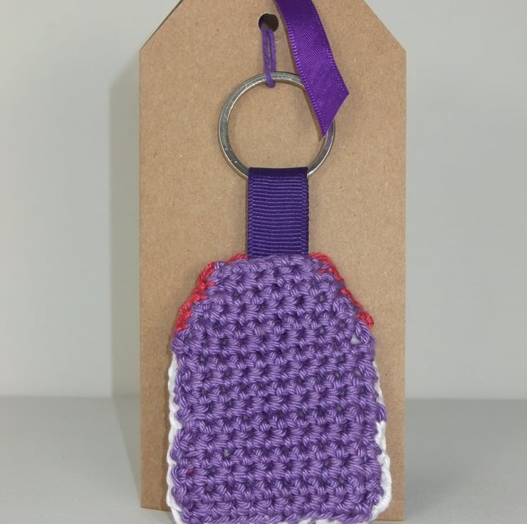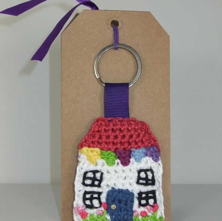 A card and gift in one, hence the tag shape. The pretty house decorating this card is part of a key ring that can be detached and used to hold the key to the recipient’s new home for years to come! The little white cottage is crocheted in 100% cotton and decorated on the front with embroidered bunting and tiny pink flowers. The doorknob is a minute bead. The back of the house is crocheted in plain mauve cotton.The house is lined inside with tough felt and strongly attached to the key ring with petersham ribbon. The house measures 7.5 cm X 5.5 cm.