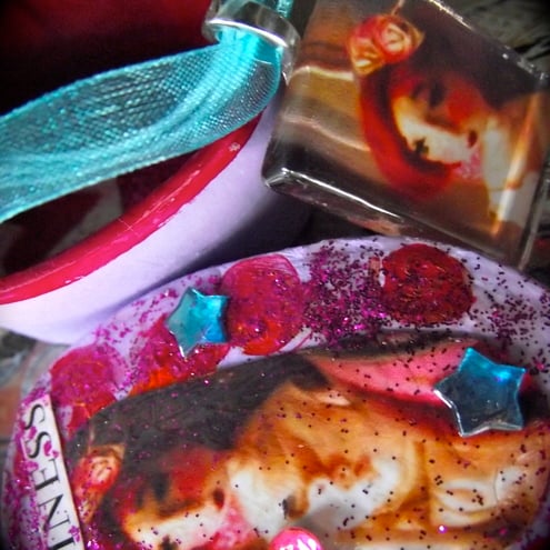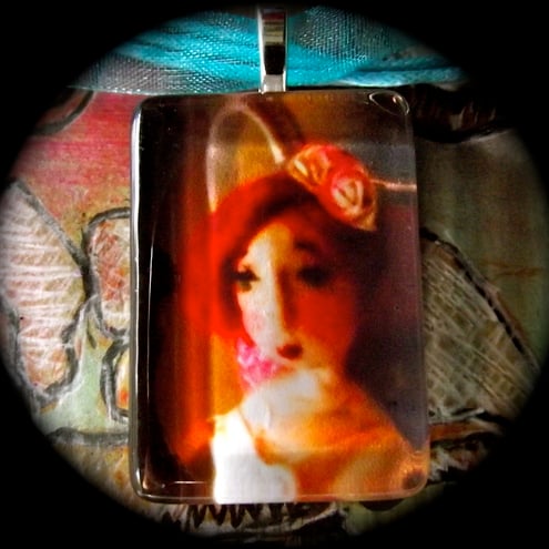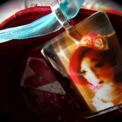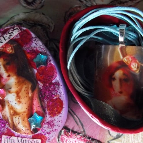 High quality glass tile pendant displaying an image of original art by myself. Sealed with glaze, worn with a pretty baby blue ribbon and saftey clasp. The pendant is accompanyed with a embelleshed pretty box, with the text MIRROR and HAPPINESS.
