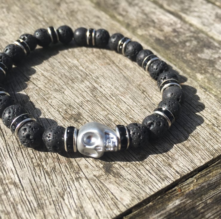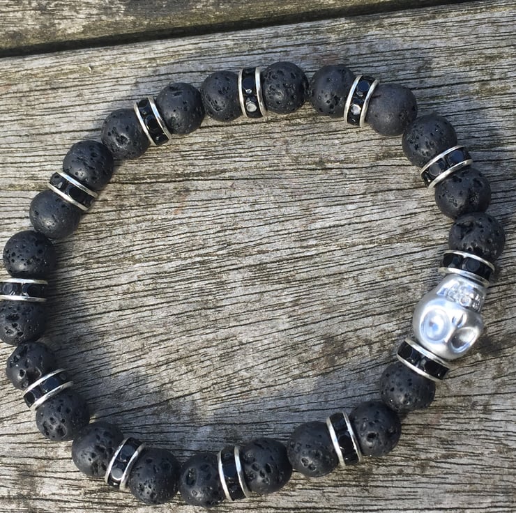Black lava beads, black silver plated gem spaces and plastic silver skull bead mens bracelet.