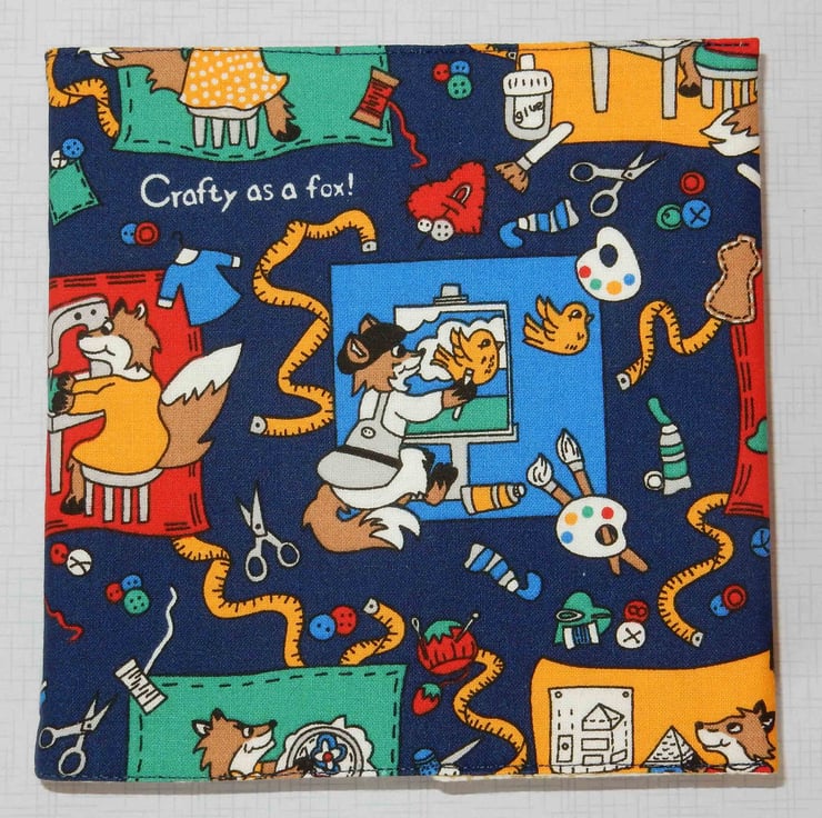 This is a sketchbook with plain pages, which could also be used as a notebook. It measures approx. 5.5 inches square. It has been covered in "Crafty Fox" printed fabric, the cover has been lined and interfaced for strength. The cover removes so that a new book can be added when needed. Ideal for keen sketchers to keep in their bag, or just to use as a notebook.
