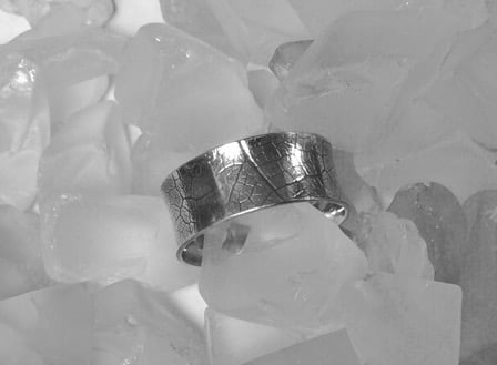 This lovely ring makes a great gift. It is made from 9mm wide sterling silver sheet, which has been imprinted with a leaf skeleton by passing it through a rolling mill. I have given the ring a flared, anticlastic shape which makes it very comfortable to put on and take off. The finely detailed surface has been accentuated by treating it with oxidising solution to darken the imprint. The ring weighs 4.6g and is currently available in size T.