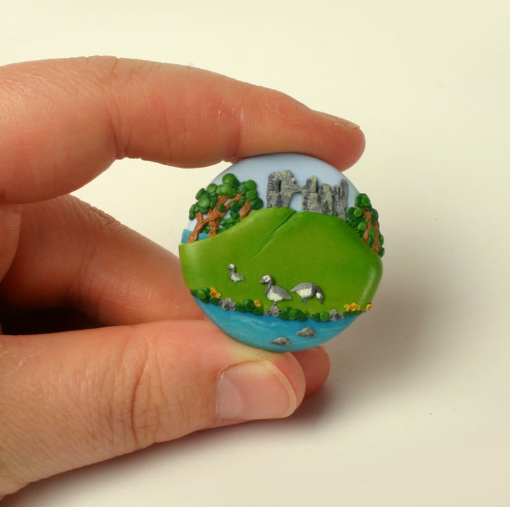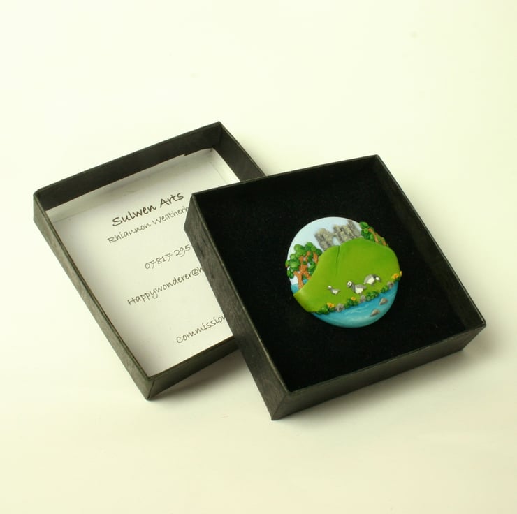 It is handmade in Polymer Clay and coated with a silk varnish. It has a standard brooch pin securely glued to the back and comes in a lovely little black cardboard jewellery box.
