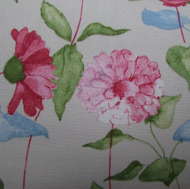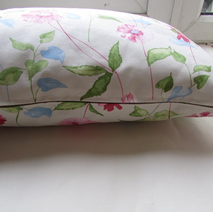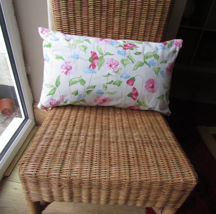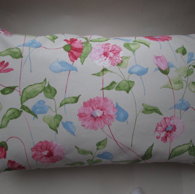 Rectangular cushion 20" (51cm) x 12" (30cm) in a beautiful floral print fabric. Cream with flowers in pretty shades of pink, green and blue..