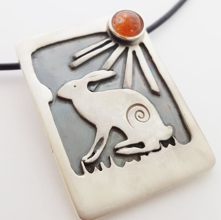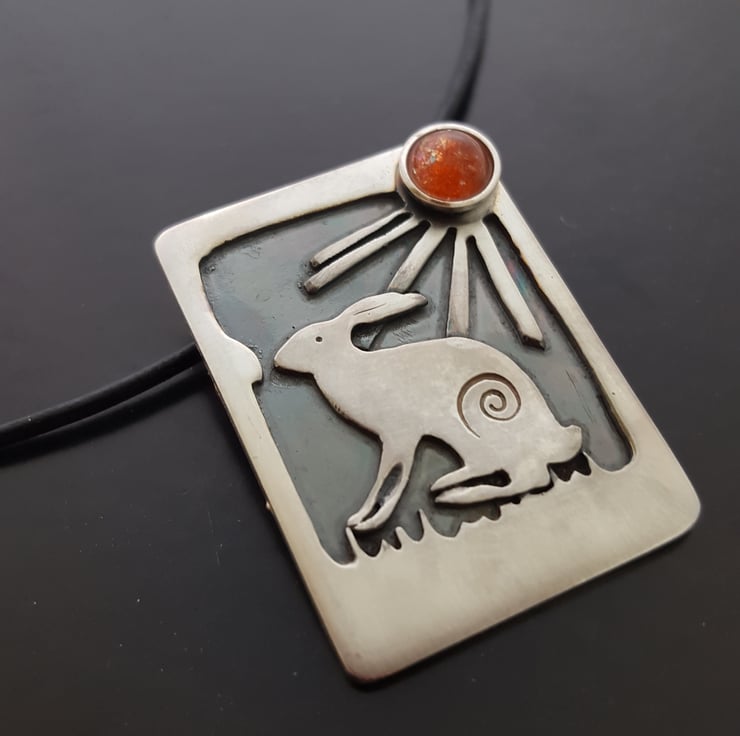 The pendant is hand made to my unique design and is made from 3 layers hand pierced from silver sheet, and soldered together to form a solid pendant, the background has been darkened to let the detail stand out, and finally it set with a sparkly sunstone cabochon.