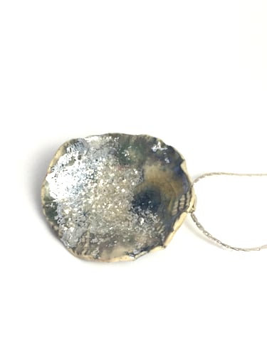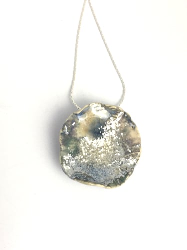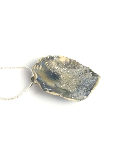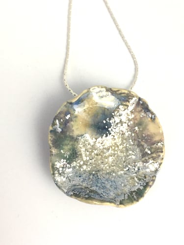 A textural ceramic necklace hand shaped with love and fired twice with a wash of slate blue-grey glaze and glass, finished with silver sparkles.