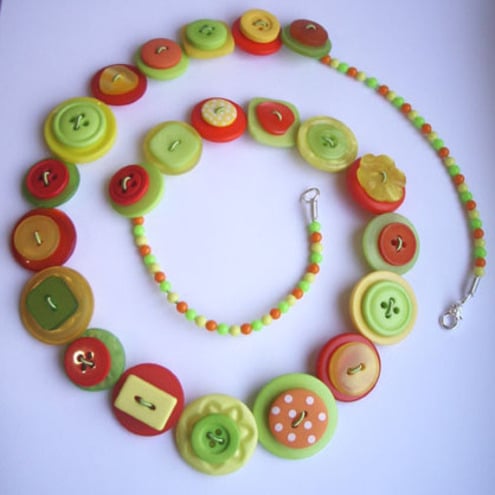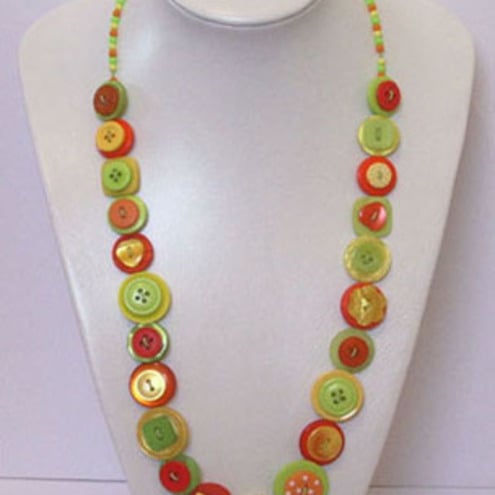 This distinctive button necklace is rich with an assortment of yellow, orange and green buttons. These are threaded onto jewellery wire, which secures at the end with a silver plated lobster clasp fastener.