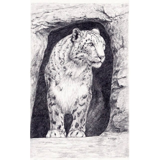 This is a unique original graphite pencil drawing of a majestic snow leopard sitting at the entrance to her den in the mouth of a cave looking out across a valley. Rarely seen in the wild, snow leopards are an endangered species. Their thick, soft, beautiful fur which enables them to survive the deep cold of winter in the mountains where they live, is perfectly suited to the soft shades of a graphite pencil drawing.