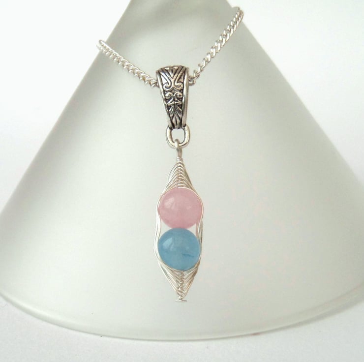 A pretty handmade necklace, made with pink & blue jade in a 'Peas in a Pod' style.
