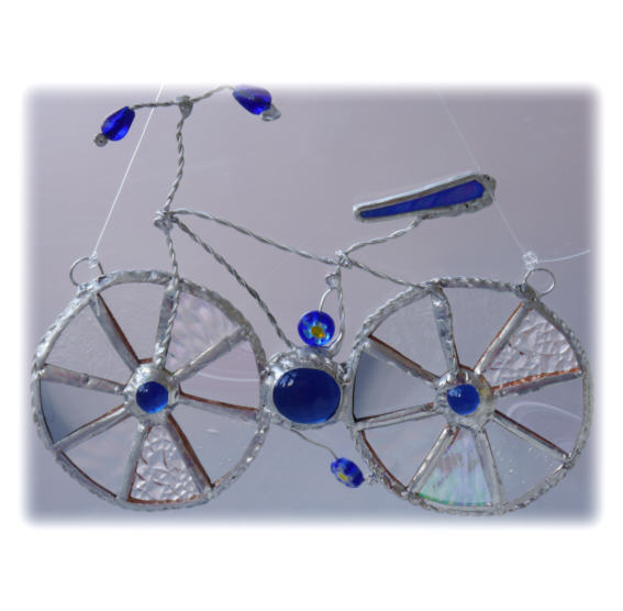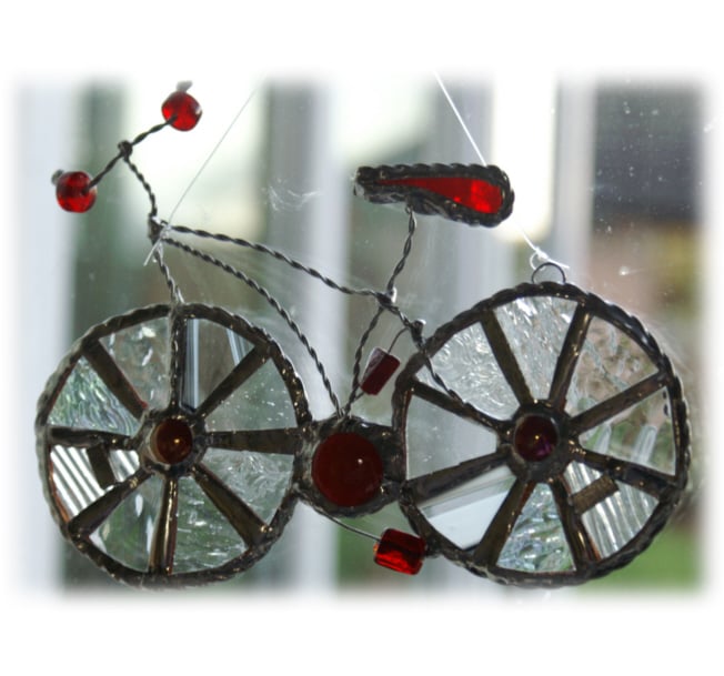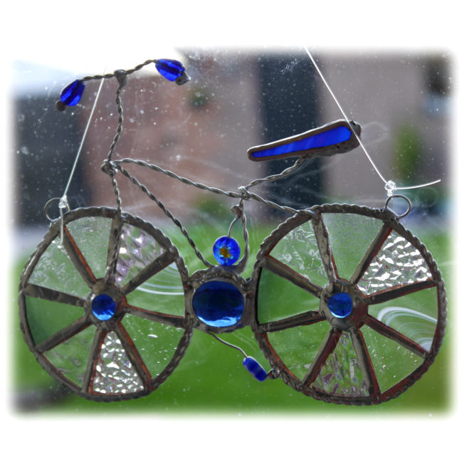 The bicycle hangs from a strong plastic line and looks quite amazing hanging in the window.