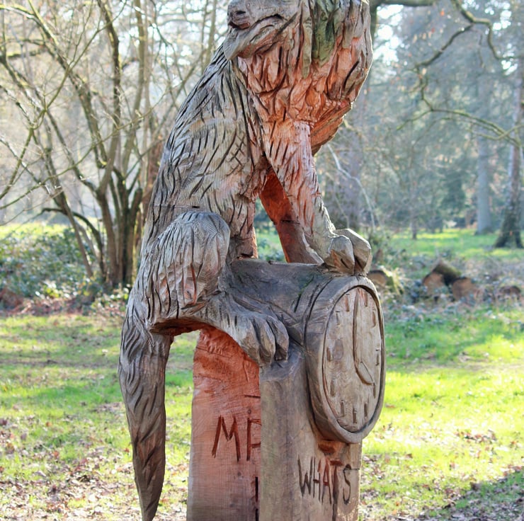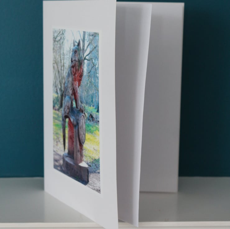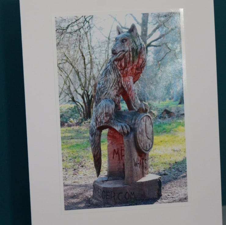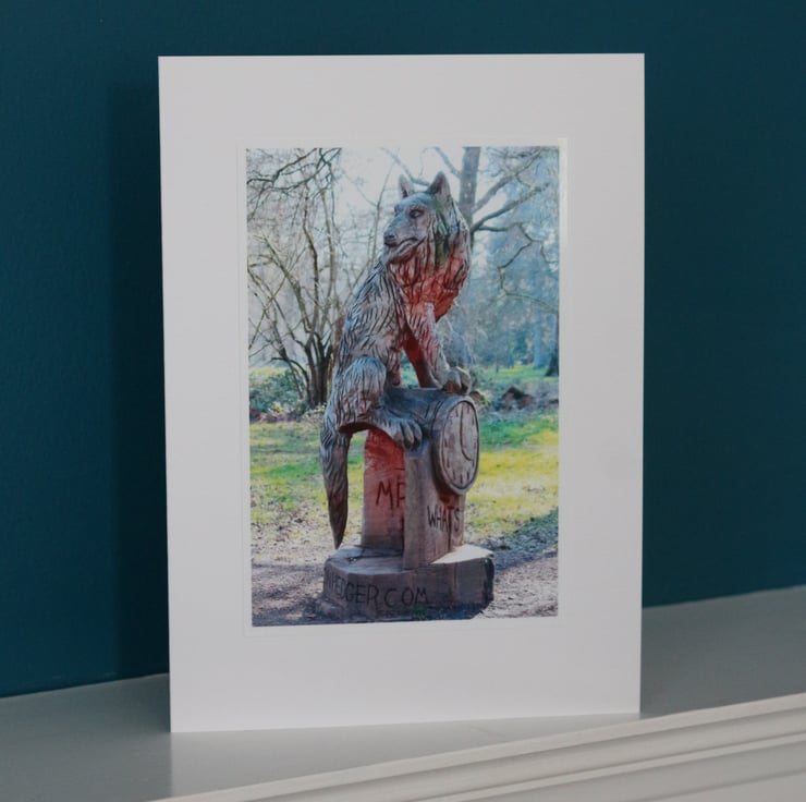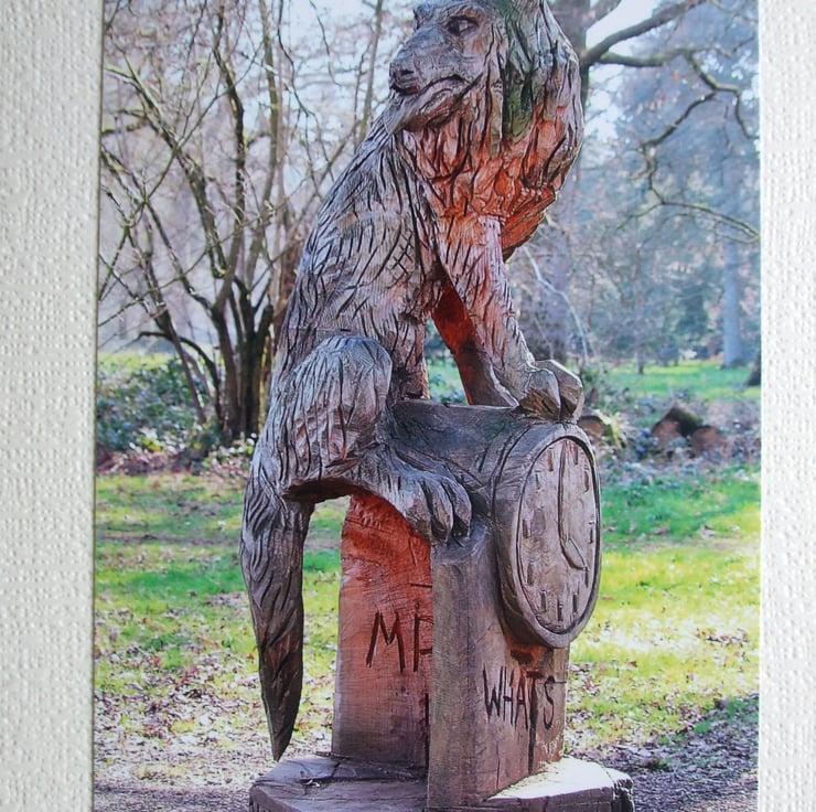 6" x 4" portrait photo of " What Time is it ?, Mr.Wolf". A large chain-saw art sculpture in Westonbirt Arboretum, Gloucestershire. The photo is mounted portrait on white textured card, has a white narrow border, with a blank white inner; left plain for your own personal message. An envelope is also included.