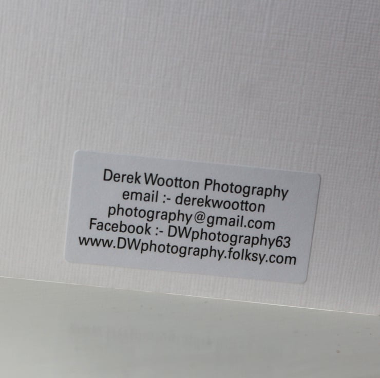 Thank you for looking at my wide range of photographic cards; hope you find some you like; if you can't and have a particular subject in mind please contact me by email :- derekwoottonphotography@gmail.com. I'll look through the 1,000's of photos I have to see if I have what you require; and don't forget the bulk buy offer, 5 cards of your choice for £8.00 plus a saving on total postage, means you save a total of £9.00 ! on the 5 cards. N.B. from 1st. Jan. 2021 all orders will be posted 2nd. class Royal Mail, ( due to their increase charges ). Also please see my cards with matching coaster and / or fridge magnet. Thanks, Derek.