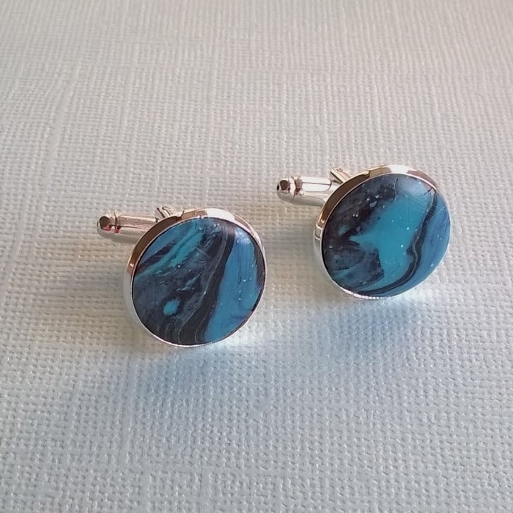 Cufflinks made with blue and black polymer clay and specks of silver glitter swirled into an interesting pattern.