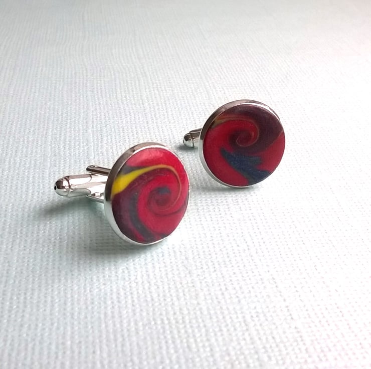 Cufflinks made with red, yellow and sparkly blue polymer clay swirled into an interesting pattern.