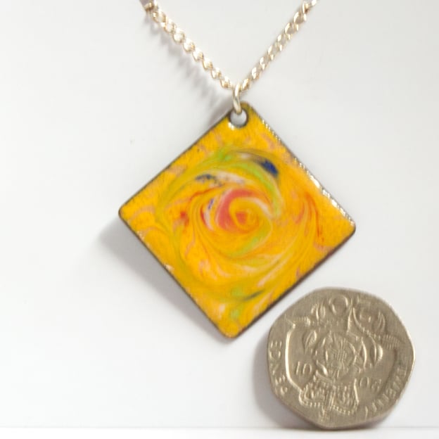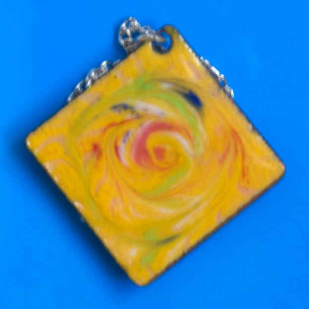 Red, green and blue enamels have been scrolled over a yellow background to make this square pendant.