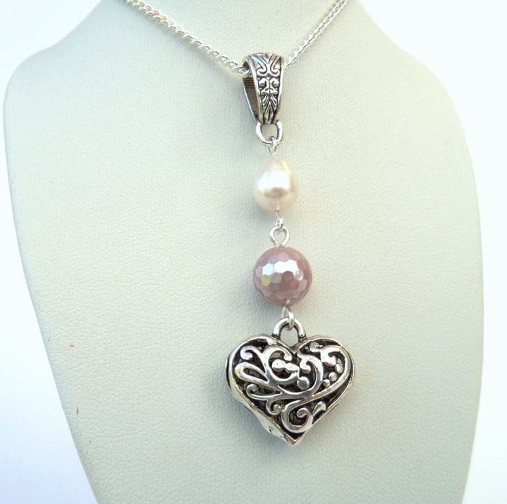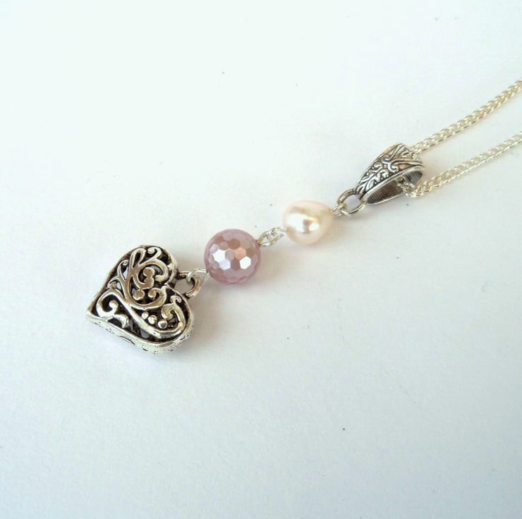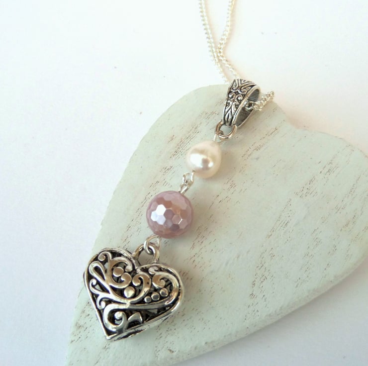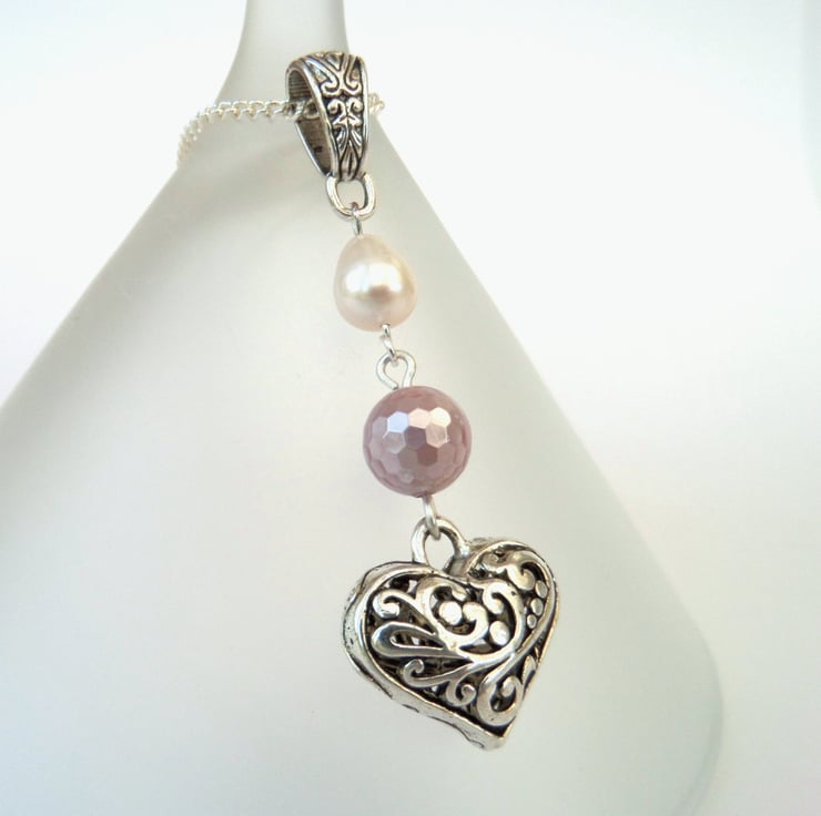 A beautiful dusky pink faceted shell pearl looks great with a single white pearl hanging with a chunky ornate tibetan silver heart charm to make this striking necklace.
