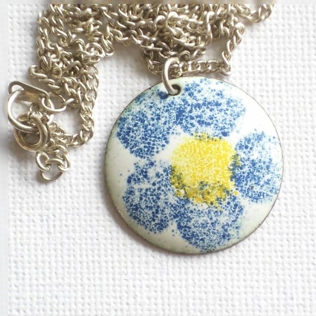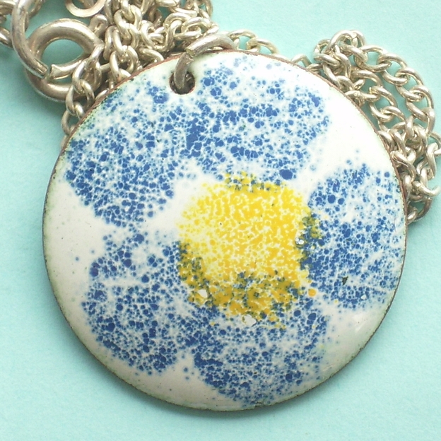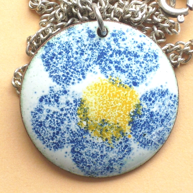 This is a white enamel pendant over which I have stencilled a flower pattern in blue and yellow enamel.