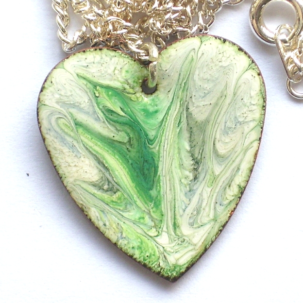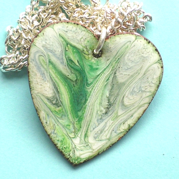 Green and grey enamel scrolled over white on this heart-shaped pendant