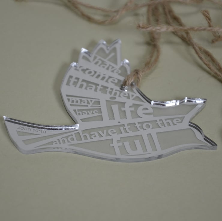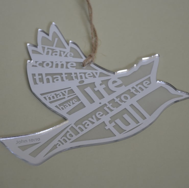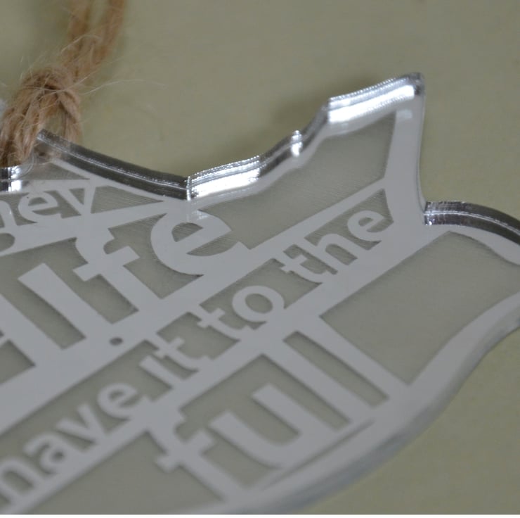I reverse-etch my design onto the back of a sheet of mirrored acrylic, laser cut them out and attach twine. The text reads: