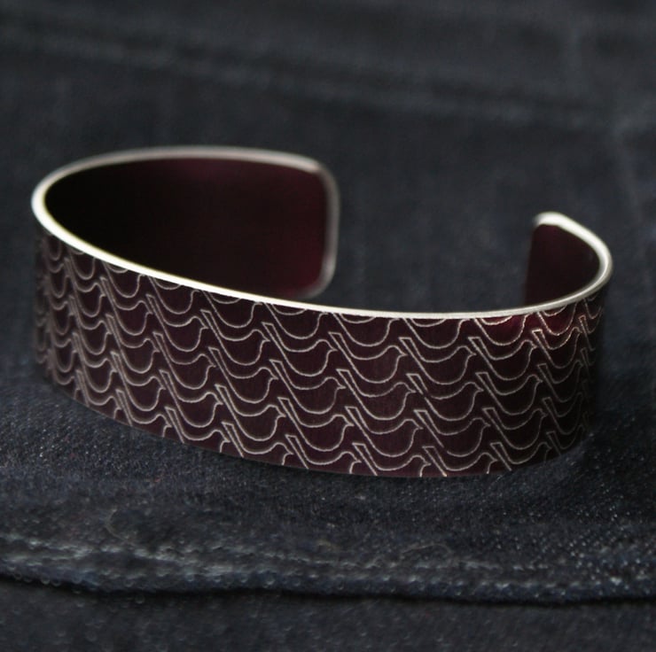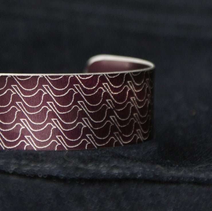 A quirky bracelet/narrow cuff made from anodised aluminium with a mini print of birds. I drew this pattern digitally, made it into a resist and applied it to the metal. I then dye the aluminium, seal it and remove the resist which leaves the pattern showing in the original colour of the metal. The cuff is then made using traditional metalworking techniques.