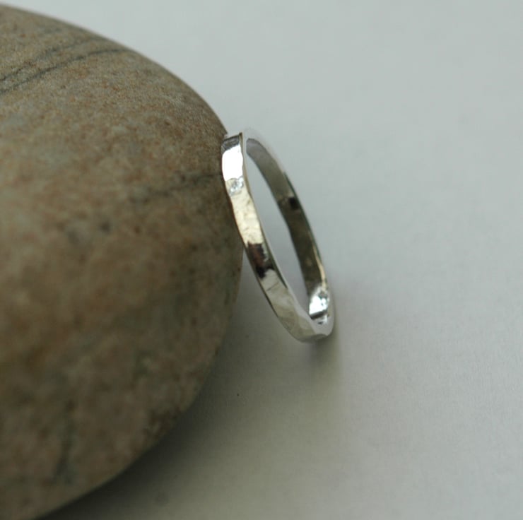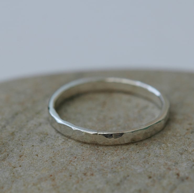 This delicate ring is made from 2mm wide sterling silver wire which has been beaten with a ball-pein hammer to create a textured surface that reflects light from many angles. It can be worn on its own or as a stacking ring. The ring weighs 1.7g and has been tumble-polished to a bright shine. I currently have sizes M, Q and R in stock. I can make other sizes to order if you allow a few extra days.
