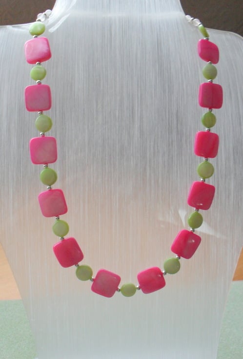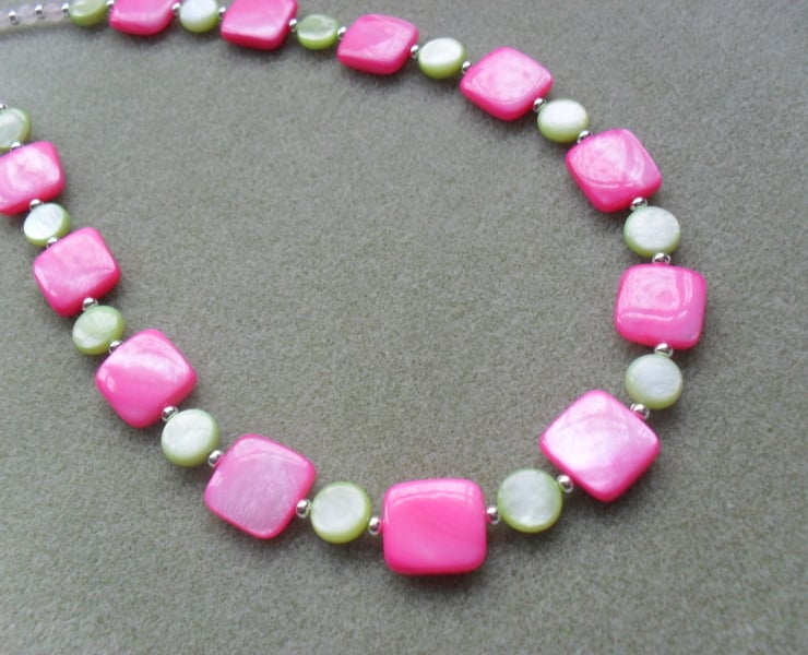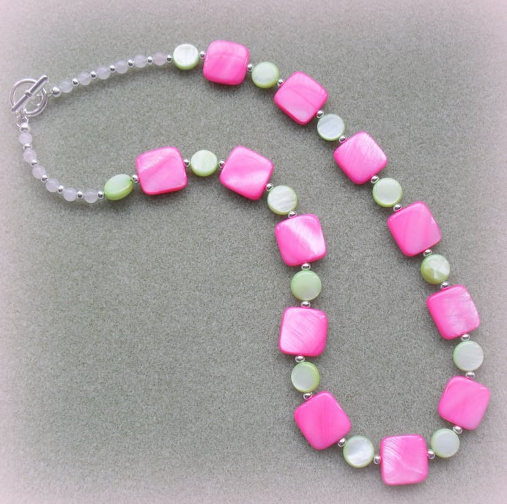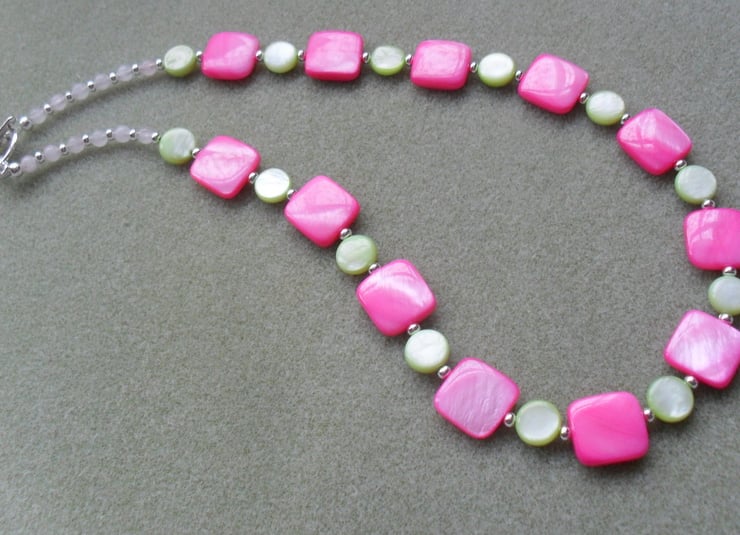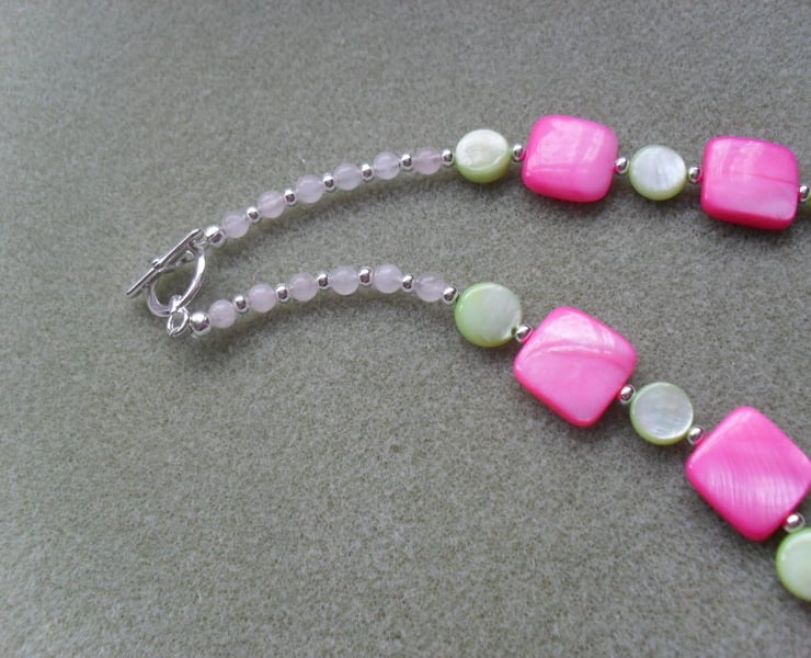 NOW £6.50 Bright pink square shaped shell and green round shell with small rose quartz and silver plated beads are attached to a silver plated toggle clasp