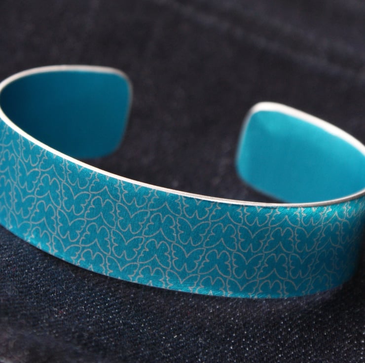 A quirky bracelet/narrow cuff made from anodised aluminium with a mini print of butteflies. I drew this pattern digitally, made it into a resist and applied it to the metal. I then dye the aluminium, seal it and remove the resist which leaves the pattern showing in the original colour of the metal. The cuff is then made using traditional metalworking techniques.