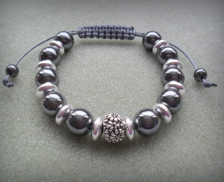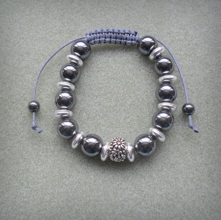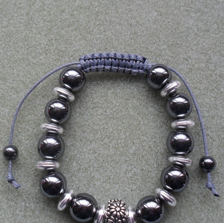 hematite beads with silver plated beads and a silver tone bead with a flower pattern in the centre are knotted on dark grey waxed cotton cord .