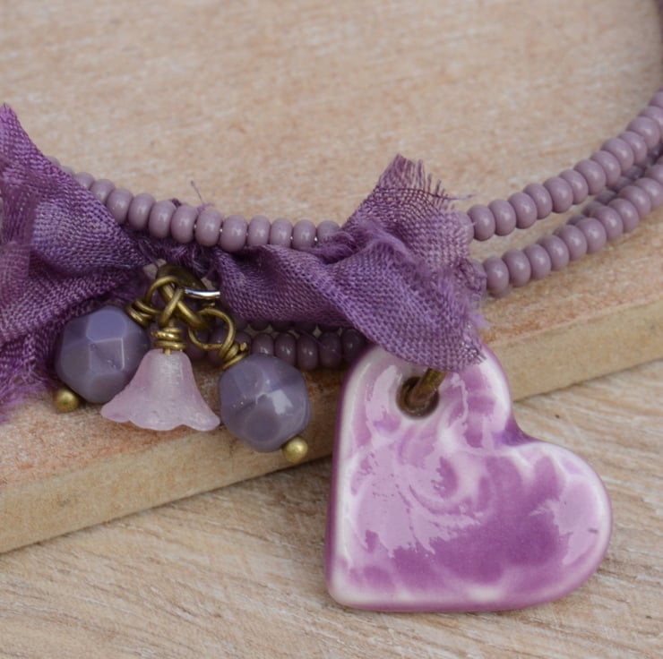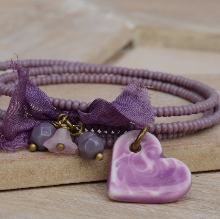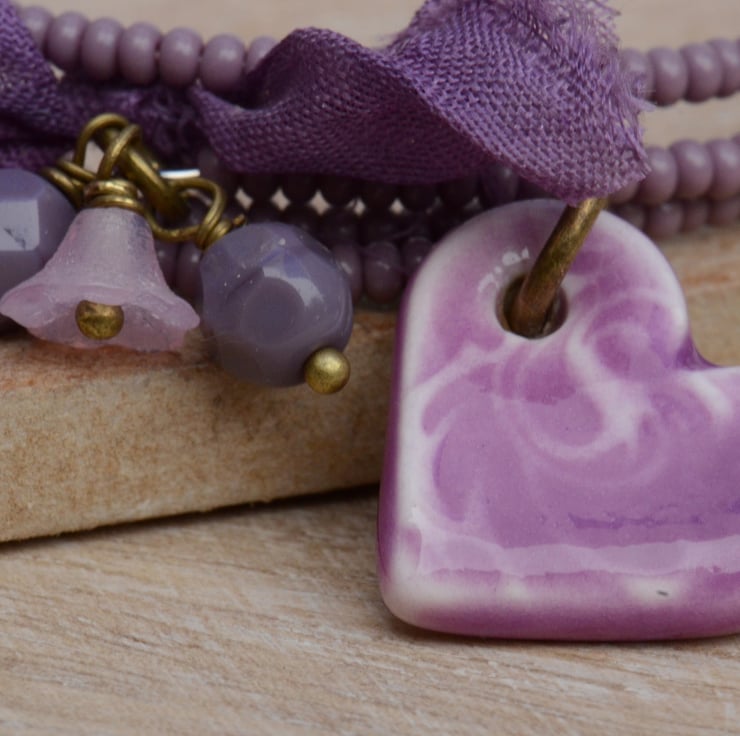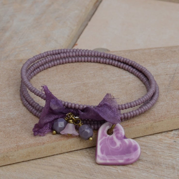 Lilac purple seed bead wrap bracelet with a lovely ceramic heart, a little bow of purple sari silk ribbon and Czech faceted lilac opaque beads and a pink flower cup.