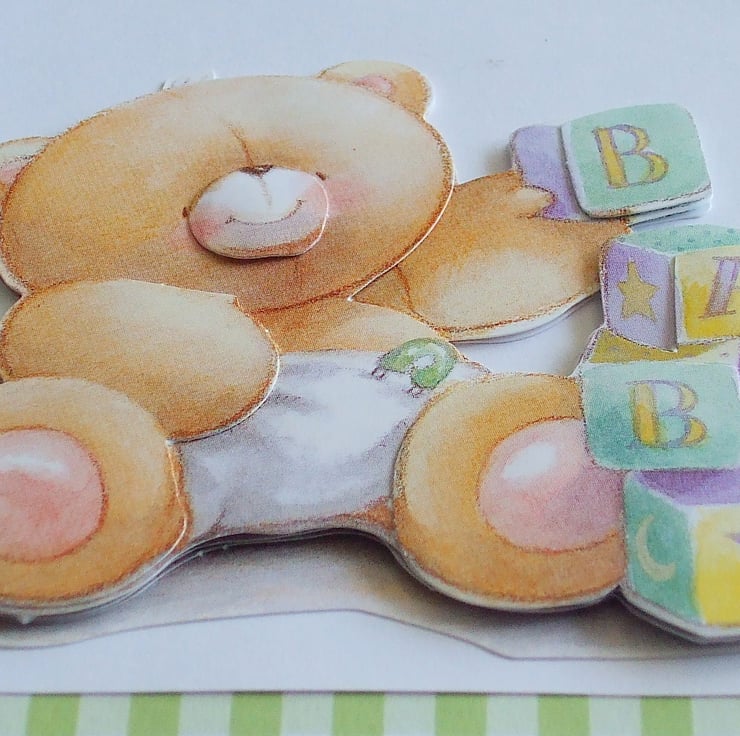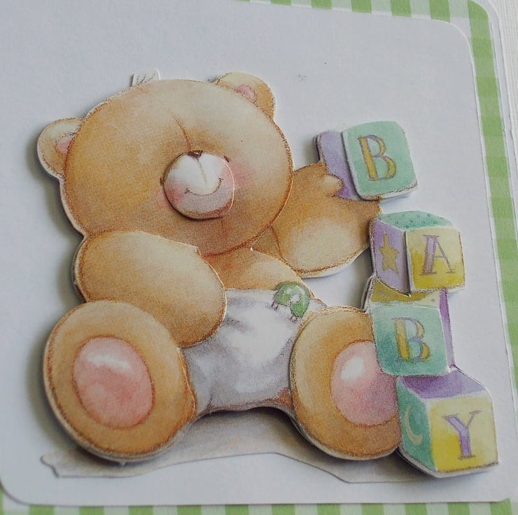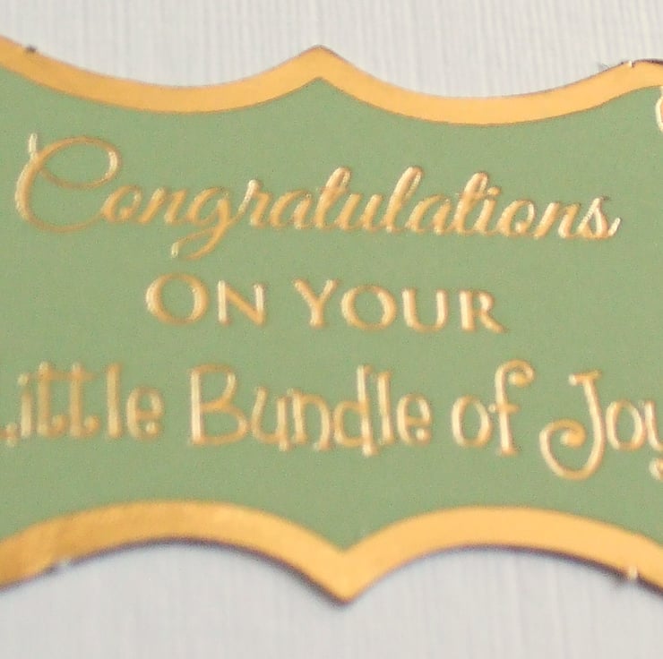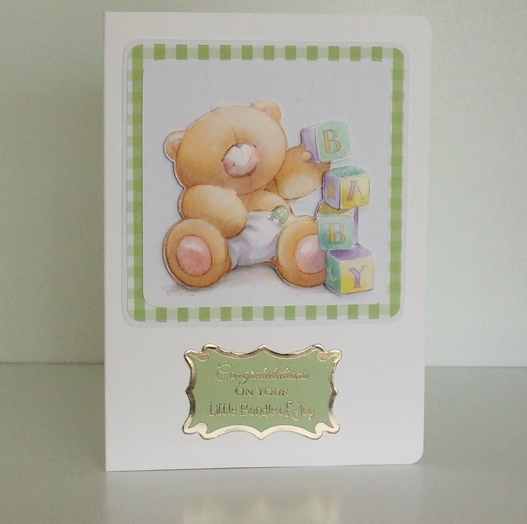 The topper for this card has been 3D decoupaged and placed onto a layer of gingham paper in a fresh green & white colourway. It has been placed at the top of a card base of white linen-effect card and I've placed a greeting at the bottom which says "Congratulations On Your Little Bundle Of Joy" this is also pale green with gold foiling.