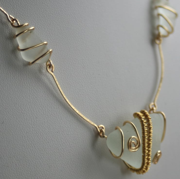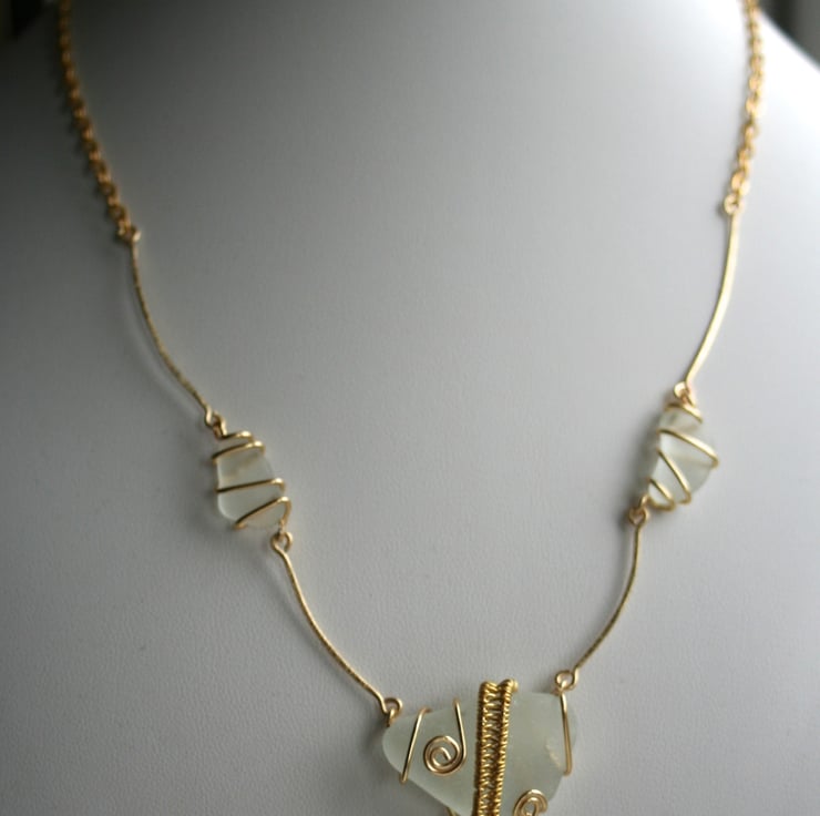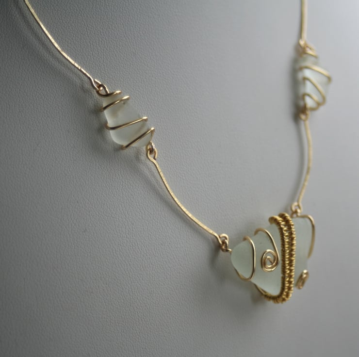 A delicate and feminine necklace made with nuggets of frosted clear/white sea glass that are wire wrapped and weaved with gold plated wire. The nuggets are joined with hammered and textured gold plated wire connectors. Gold plated trace chain and a lobster claw clasp finish the necklace.