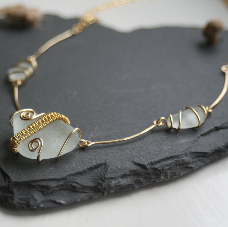 I've always been at a bit of a loss as to what to do with sea glass as the pieces I generally find are tiny. However, on holiday in Barcelona I found these larger pieces that were big enough to wire wrap. They look beautiful against the gold wire, perfect for a sunny summer holiday or wedding!